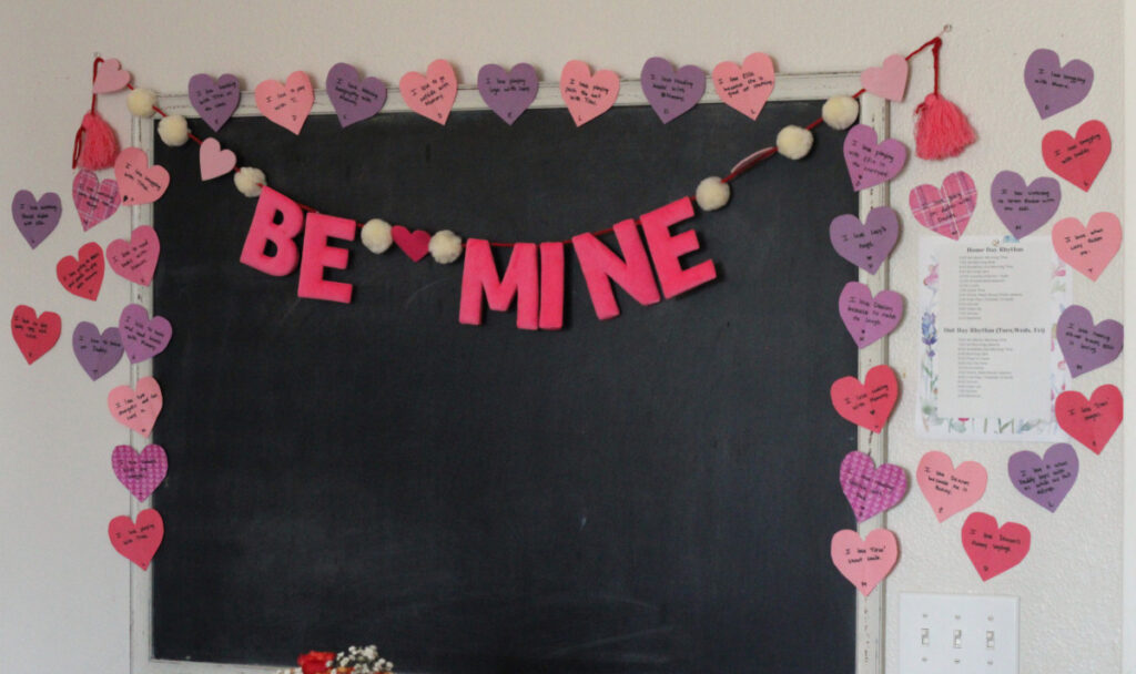 We love to start February 1st by beginning our Love Wall! Each night during dinner, we go around our table and ask each person to share something they love about another member of our family. As we do this, we remind our kids that love can be easily expressed with words. Next, we ask them to notice how they feel when someone says something loving to them. This helps them recognize the value of using words to express love.